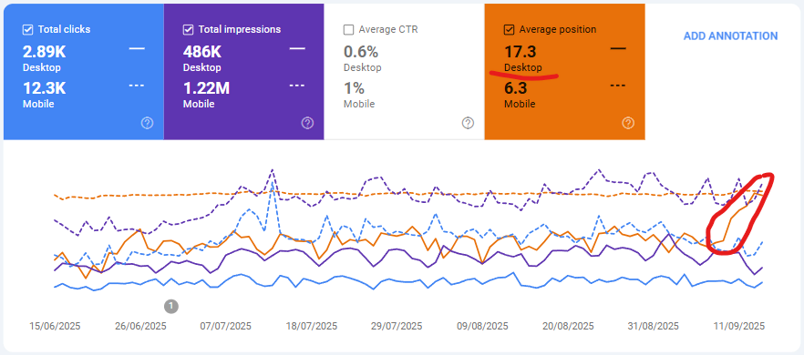 Na screenie widać wzrost średniej pozycji, bez zmiany liczby wyświetleń czy ruchu. Choć są zgłaszane przypadki, gdzie następuje drastyczny spadek wyświetleń.