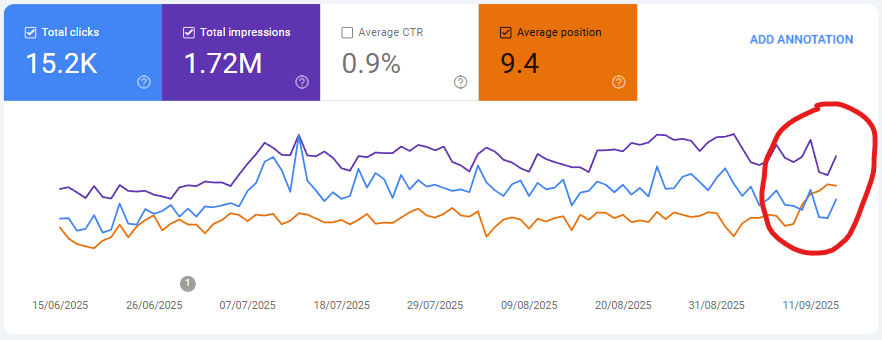 - Google Search Console: co ciekawe, problem dotknął również danych w GSC – przykład poniżej